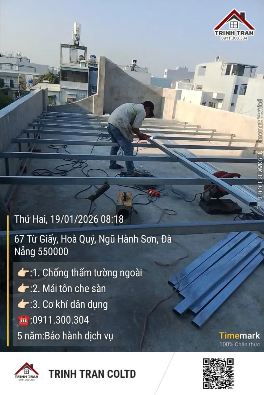 Cơ khí dân dụng Trinh Trần cam kết thi công đúng kỹ thuật, đúng tiến độ, báo giá rõ ràng, minh bạch và có chế độ bảo hành cụ thể cho từng hạng mục mái tôn chống nóng – chống thấm sàn mái. Đội ngũ thợ tay nghề cao, làm việc tận tâm, luôn tư vấn giải pháp tối ưu chi phí nhưng vẫn đảm bảo hiệu quả và độ bền lâu dài cho công trình.