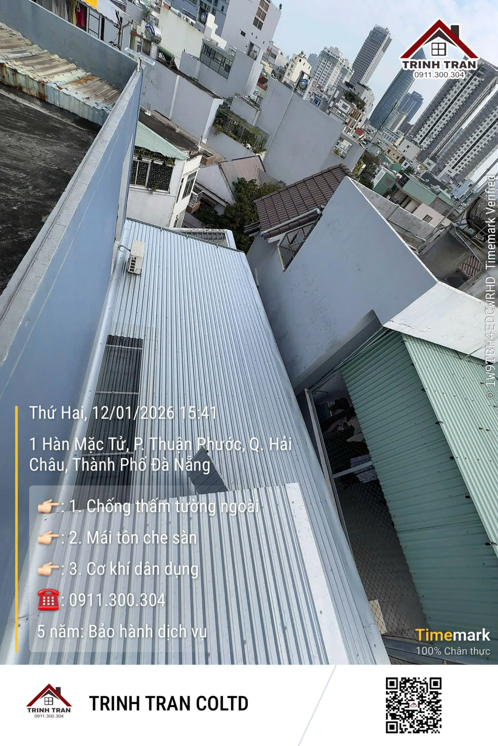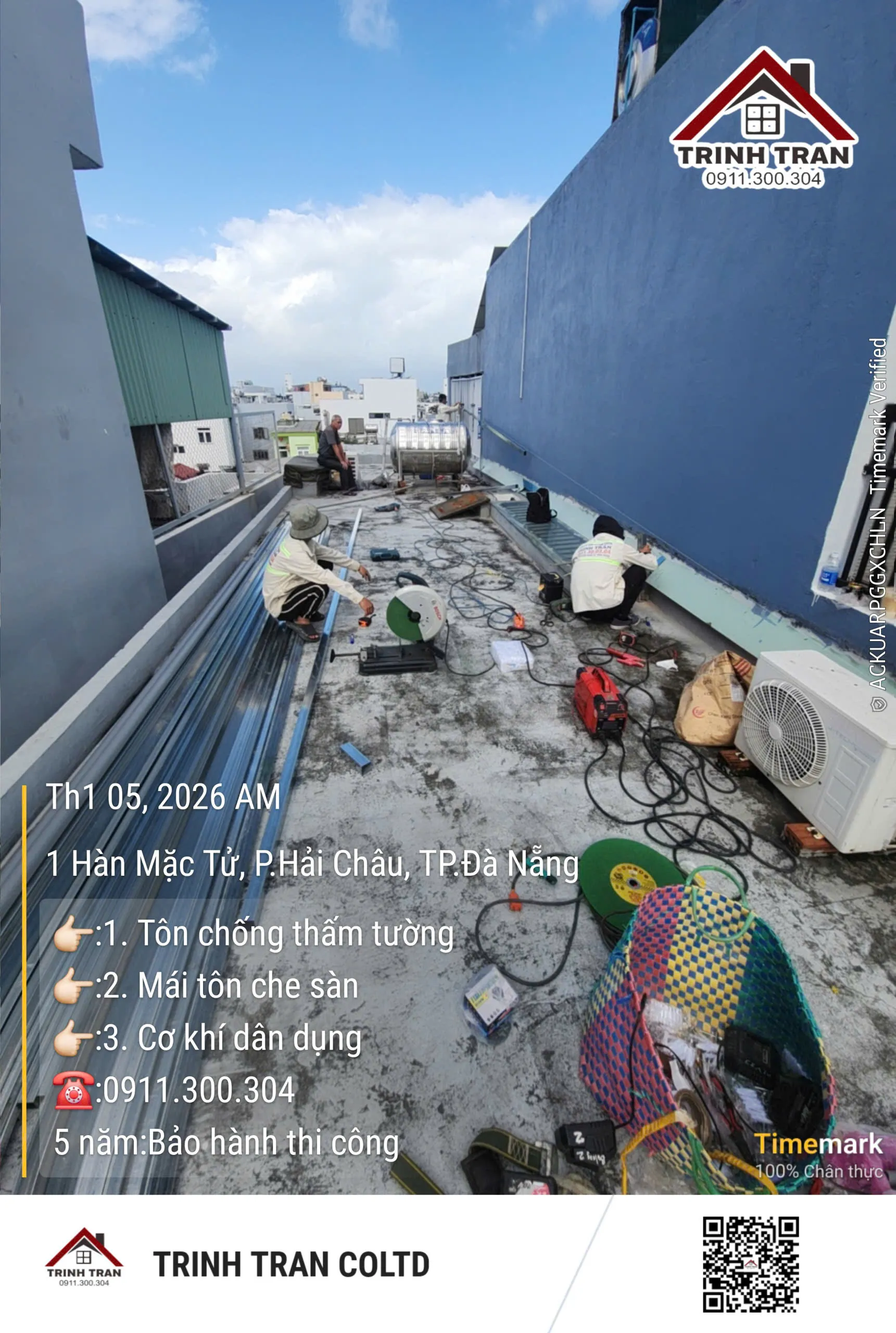Cơ khí dân dụng Trinh Trần chuyên thi công mái tôn chống nóng – chống thấm sàn mái cho nhà phố, nhà ở dân dụng và nhiều công trình khác tại Đà Nẵng. Chúng tôi cam kết thi công đúng kỹ thuật, đảm bảo tiến độ, báo giá minh bạch và có chế độ bảo hành rõ ràng cho từng hạng mục.